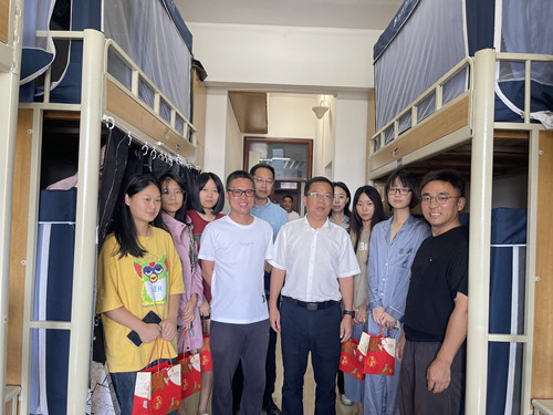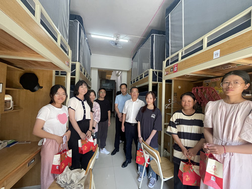 王佑镁一行首先走访了学生宿舍11号楼,对学生代表们表示了关心和问候,接着前往青年之家社区分别看望了新生学生代表、老生学生代表及省外学生代表,校领导和同学们亲切交谈,详细询问同学们学习、生活情况,关心关注同学们的宿舍环境,嘱咐他们假期出行注意安全,度过一个欢乐祥和的中秋国庆双假期,并为他们送上节日慰问品。