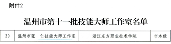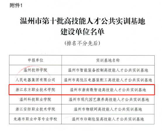 近日,中共温州市委人才工作领导小组办公室、温州市人力资源和社会保障局、温州市财政局联合发文公布了温州市第十批高技能人才公共实训基地和第十一批技能大师工作室名单,浙江东方职业技术学院温州市浙南数智造高技能人才公共实训基地、张仁技能大师工作室入选。