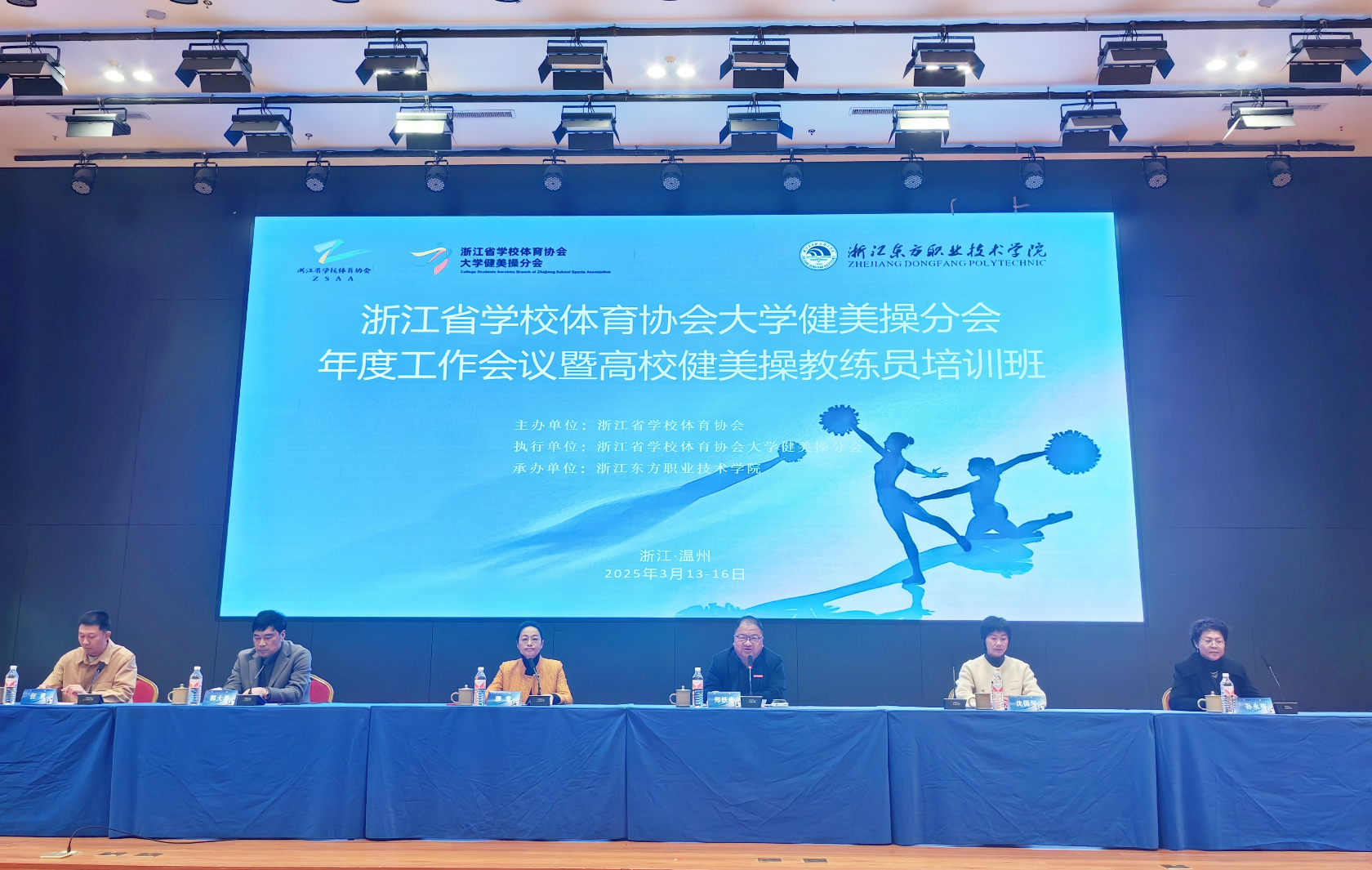 3月13日—16日,浙江省学校体育协会大学健美操分会2025年度工作会议暨高校健美操教练员培训班在浙江东方职业技术学院顺利举行。浙江省学校体育协会大学健美操分会副主席滕青、郭大勇、沈国琴,浙江省学校体育协会大学健美操分会秘书长任勇,学校党委委员、纪委书记、体委主任郑铁豪,体育部负责人等出席会议,全省各高校健美操教练员160余人参会。