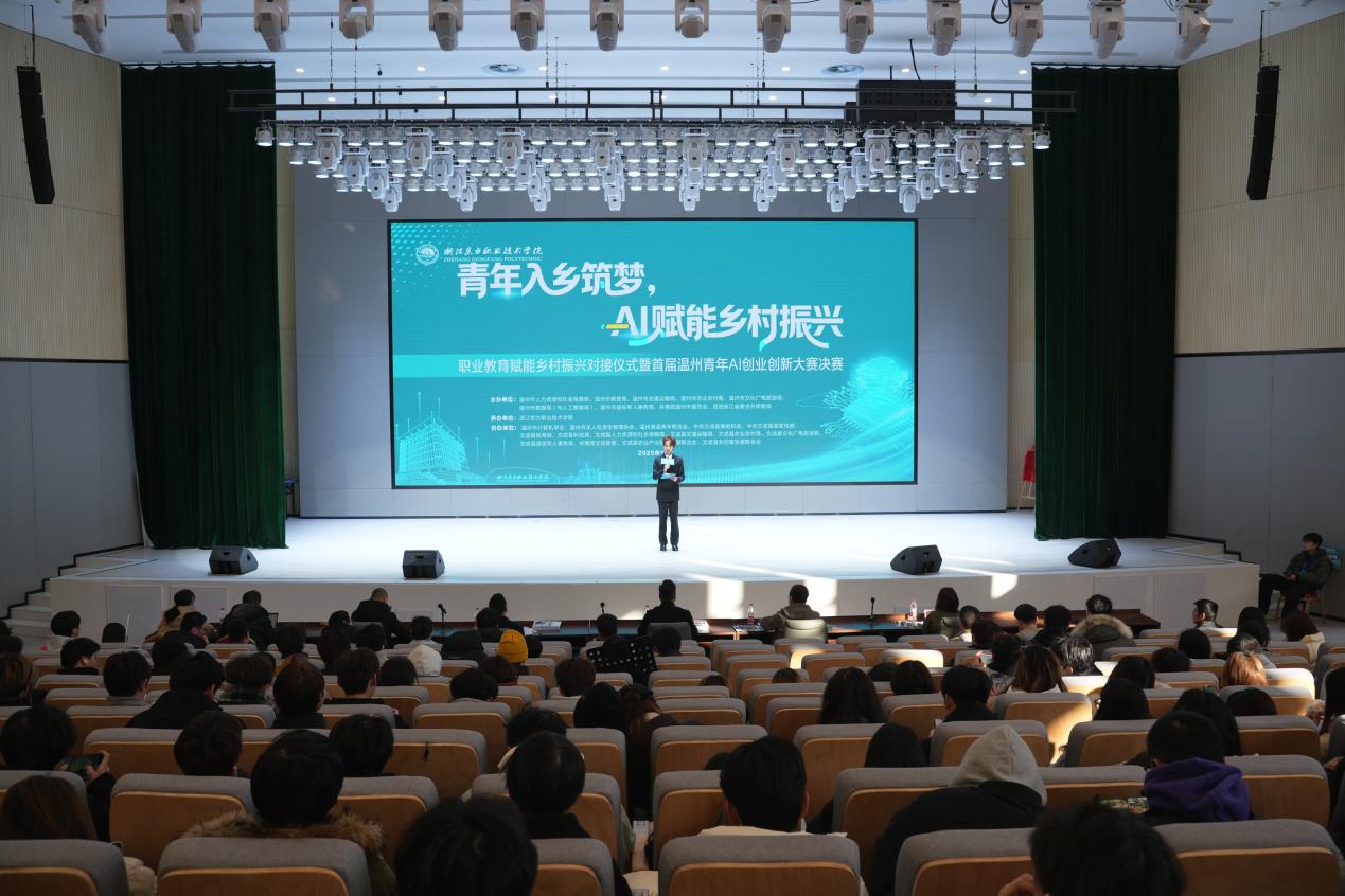 12月26日至27日,聚焦科技、人才与乡村振兴的盛会在浙江东方职业技术学院文成校区成功举办。活动涵盖首届温州青年AI创业创新大赛决赛、职业教育赋能乡村振兴对接仪式暨大赛闭幕式等核心环节,500余名省市县各级领导、行业企业代表、创业导师及高校师生齐聚一堂,共同见证职业教育与AI创新深度融合赋能乡村振兴的生动实践。