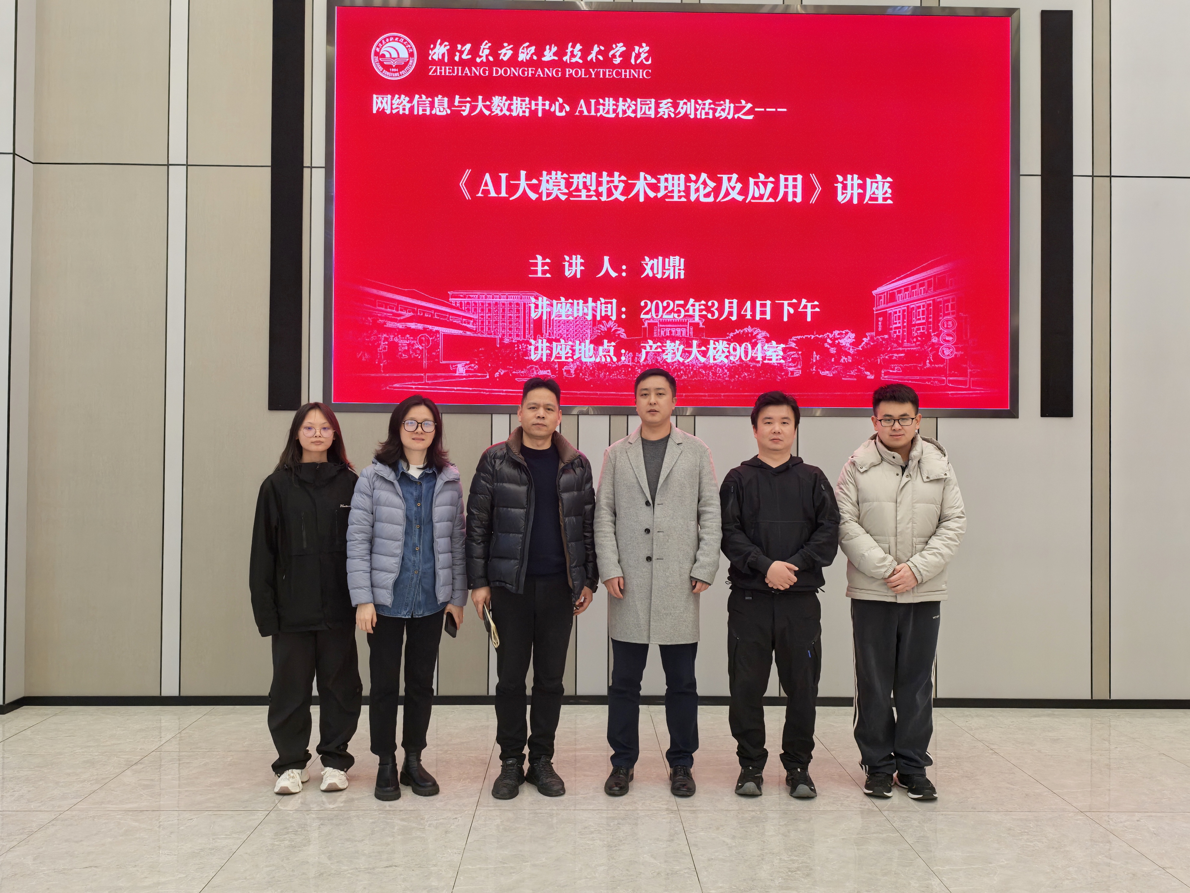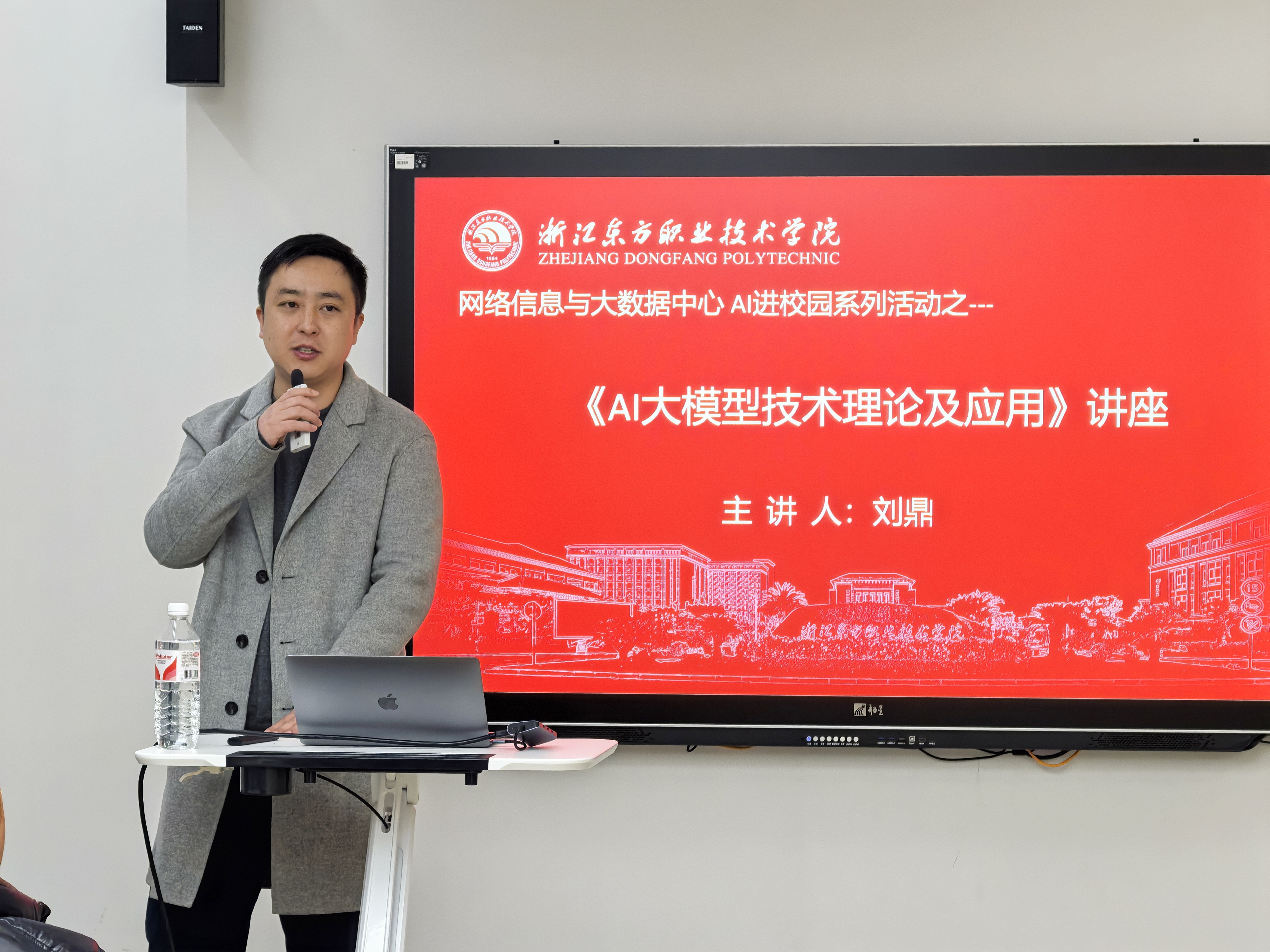 为拓宽学生视野,了解人工智能领域前沿动态,激发对人工智能领域的兴趣,3月4日,浙江东方职业技术学院特邀阿里云架构师刘鼎来校,在产教大楼904智慧教室作题为“AI大模型技术理论及应用”的专题讲座。本次讲座由网络信息与大数据中心主办,各二级学院学生到场聆听。