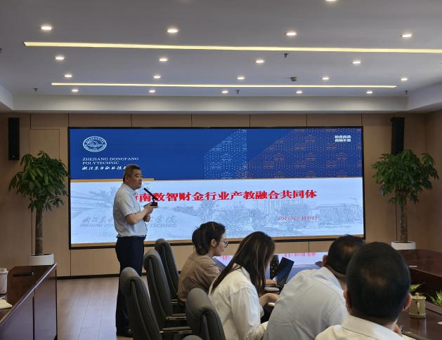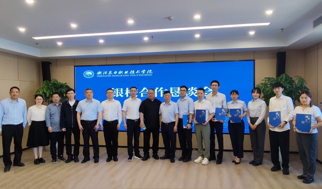 5月13日下午,浙江东方职业技术学院举办银校合作恳谈会。温州市金融工作服务中心、台州银行温州分行、中国人寿温州分公司、太平洋保险温州分公司、龙湾农村商业银行、泰隆银行温州分行、阳光财产保险温州中心支公司、浦东发展银行温州分行相关负责人,校党委委员、纪委书记郑铁豪,校地合作处、教务处等负责人及智慧财务学院师生代表齐聚一堂,共商金融领域产教融合发展大计,为金融行业创新变革与区域经济发展擘画银校合作新蓝图。