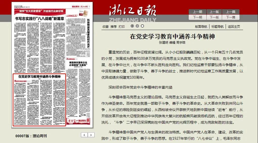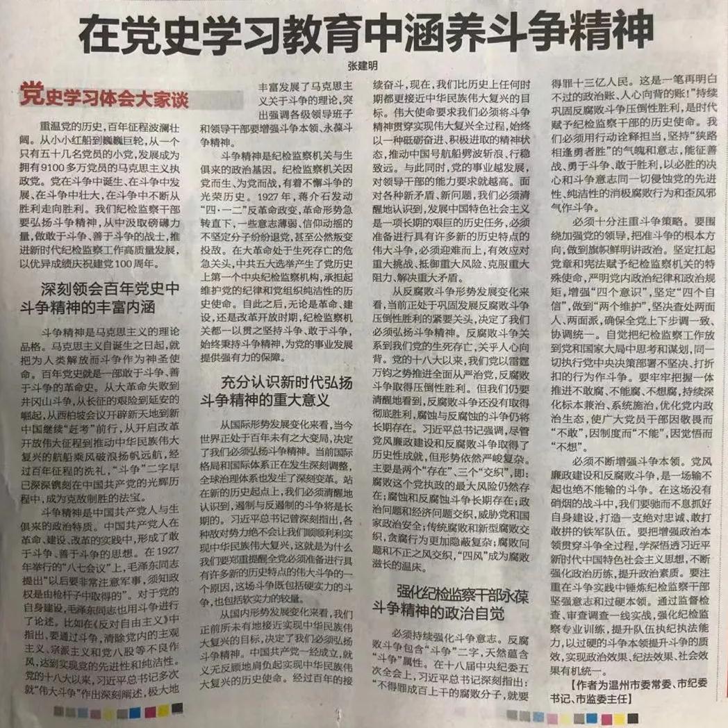 重温党的历史,百年征程波澜壮阔。从小小红船到巍巍巨轮,从一个只有五十几名党员的小党,发展成为拥有9100多万党员的马克思主义执政党。党在斗争中诞生、在斗争中发展、在斗争中壮大,在斗争中不断从胜利走向胜利。我们纪检监察干部要弘扬斗争精神,从中汲取磅礴力量,做敢于斗争、善于斗争的战士,推进新时代纪检监察工作高质量发展,以优异成绩庆祝建党100周年。