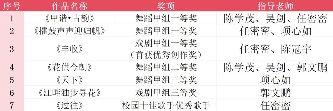 浙江东方职业技术学院在本次大学生艺术节中荣获舞蹈组一等奖2项、二等奖1项、三等奖1项;戏剧组一等奖1项(首获优秀创作奖)、三等奖1项;“校园十佳歌手”优秀歌手1项。