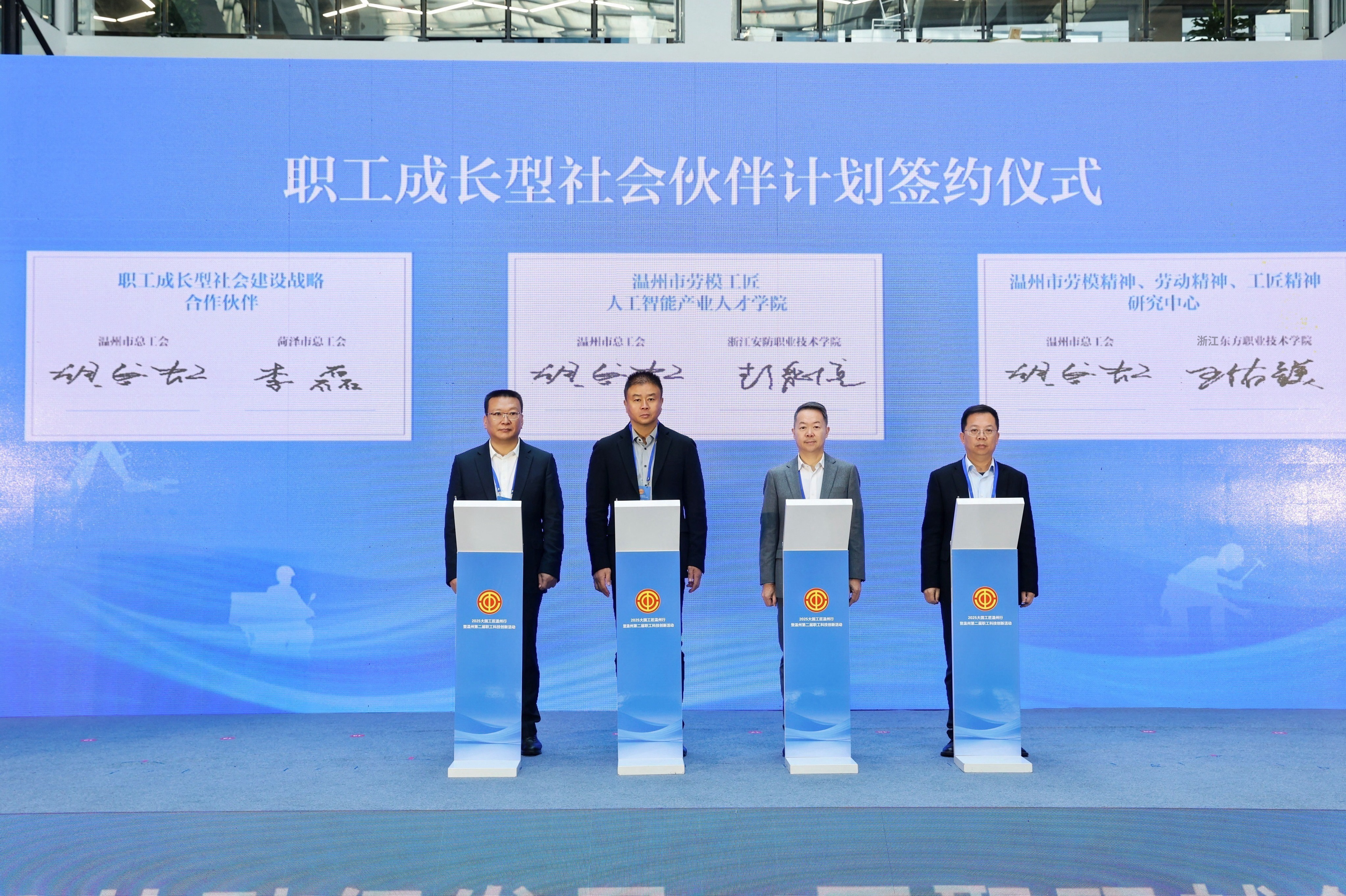 签约仪式前,学校还邀请了中国劳动关系学院、温州市劳模协会及十余位全国劳模、大国工匠等来校指导交流。
