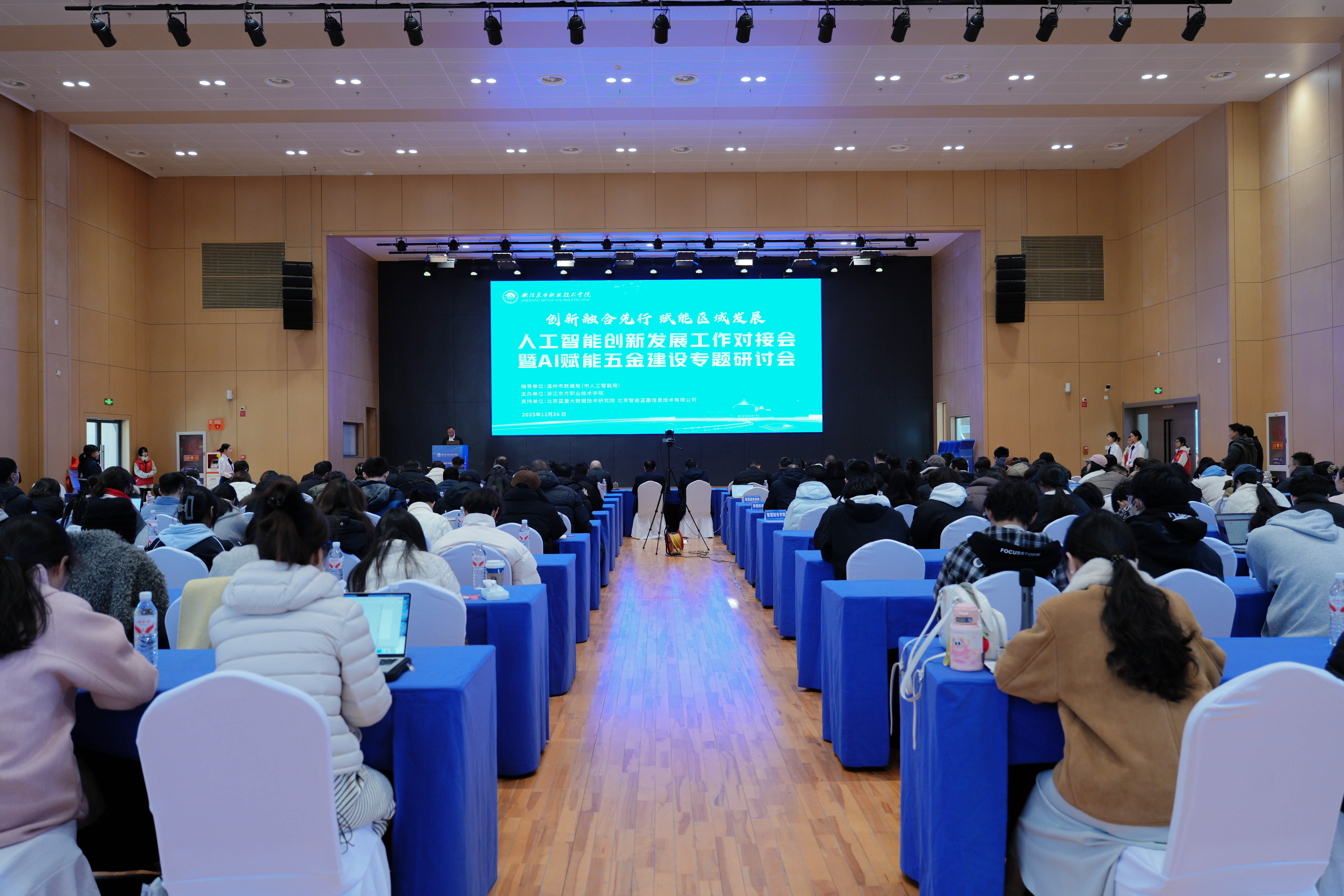 为深入贯彻落实国家关于教育数字化与人工智能融合发展的战略部署,推动学校人工智能创新工作的实质性进展,以人工智能创新赋能教育教学与区域发展,12月26日,由温州市数据局(市人工智能局)指导,浙江东方职业技术学院主办的人工智能创新发展工作对接会暨AI赋能五金建设专题研讨会在浙江东方职业技术学院成功举办。温州市数据局(市人工智能局)党组书记、局长孙祥光,温州理工学院副校长孙芙蓉教授,浙江东方职业技术学院校领导王佑镁、刘玲玲、郑铁豪等出席会议。在温高校代表、行业企业嘉宾及学校教师骨干近160人参会。会议由浙江东方职业技术学院党委委员、副校长张小冰主持。