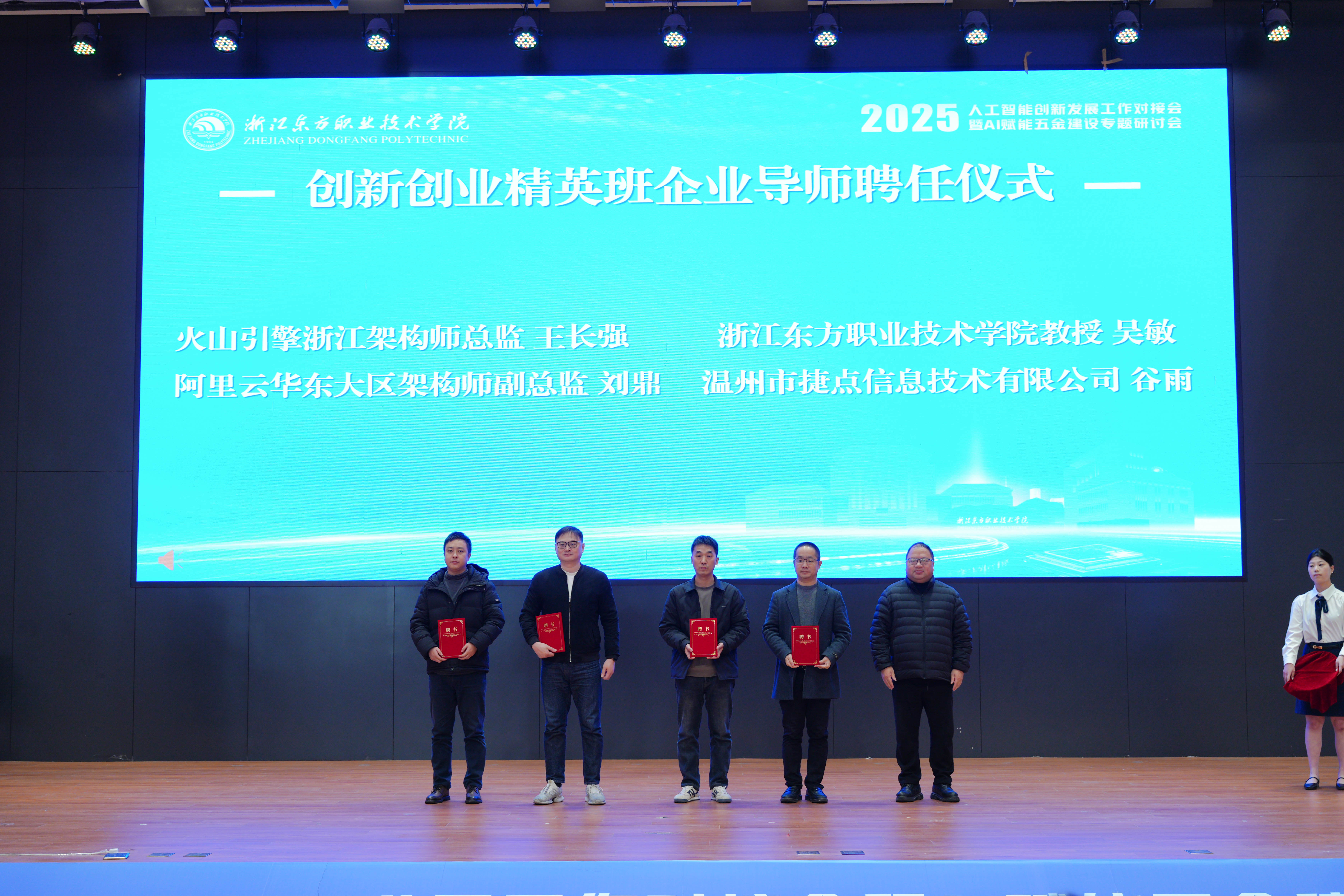 会上,一批聚焦产业前沿、促进学科交叉融合的人工智能创新项目正式启动。为深化产教融合,学校系统构建“AI+学科协同创新平台”,以人工智能技术为驱动,促进多学科交叉融合,着力培养适应未来的复合型人才,积极服务区域智能化转型与高质量发展;会上还发布了学校与温州市捷点信息技术有限公司联合打造的“东方捷点智能体开发平台”。同时,学校为首期“智能体创新创业精英班”举行企业及校内导师聘任仪式,并向来自行业与校内的专家颁发聘书。