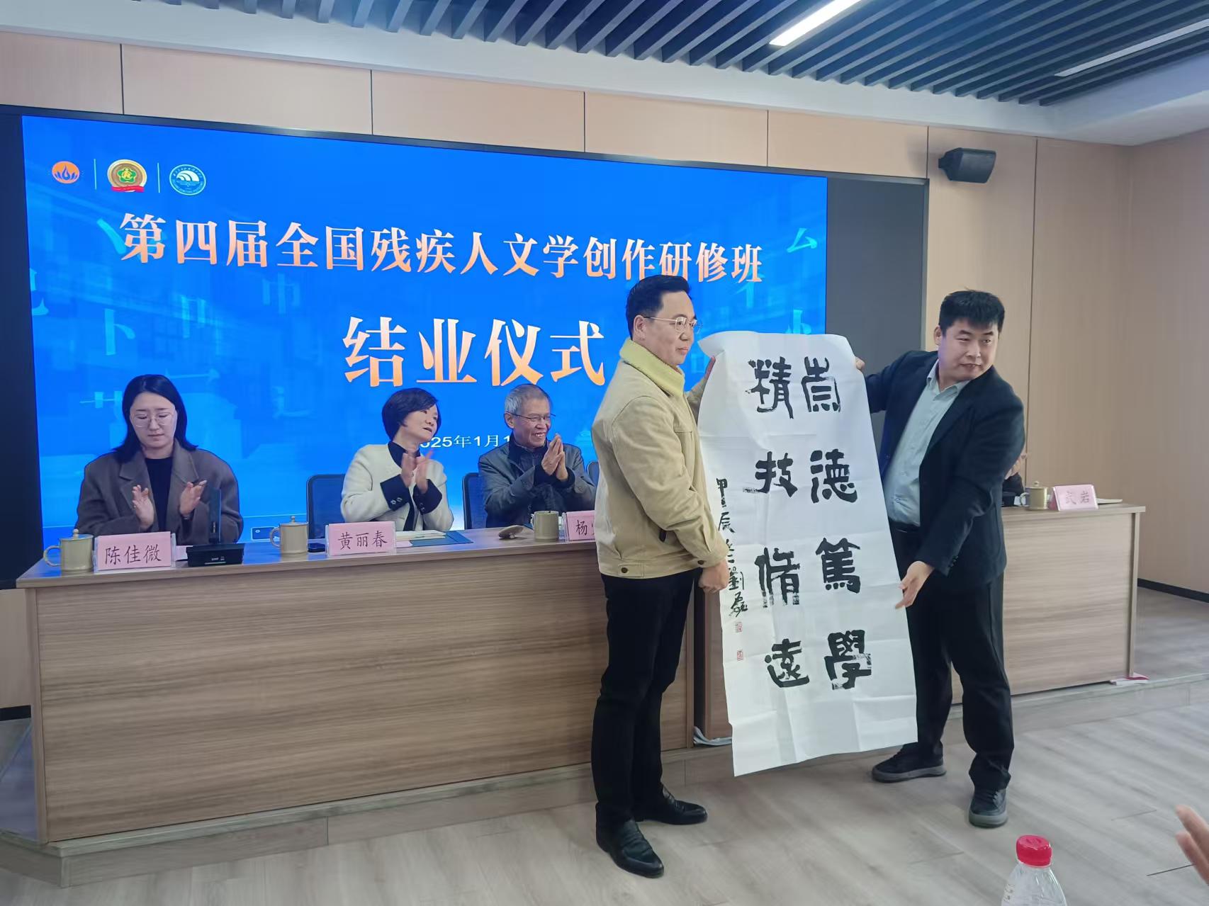 结业仪式上,中国残疾人事业新闻宣传促进会向温州市残联、浙江东方职业技术学院捐赠了书法作品;星云文化教育公益基金会向浙江东方职业技术学院捐赠了书籍。与会嘉宾向学员代表和优秀学员分别颁发了结业证书和优秀学员证书。来自内蒙古的张慧婷,四川的雷文作为学员代表分享了研修收获和体会,他们表示,研修班是一次深刻的文学与心灵之旅,从理论知识到创作技巧,大家相互学习,相互启发,提升了文学素养,拓宽了创作视野,收获了同学情谊,今后要以更加坚定的理想信念和饱满的创作热情投入到文学创作中。