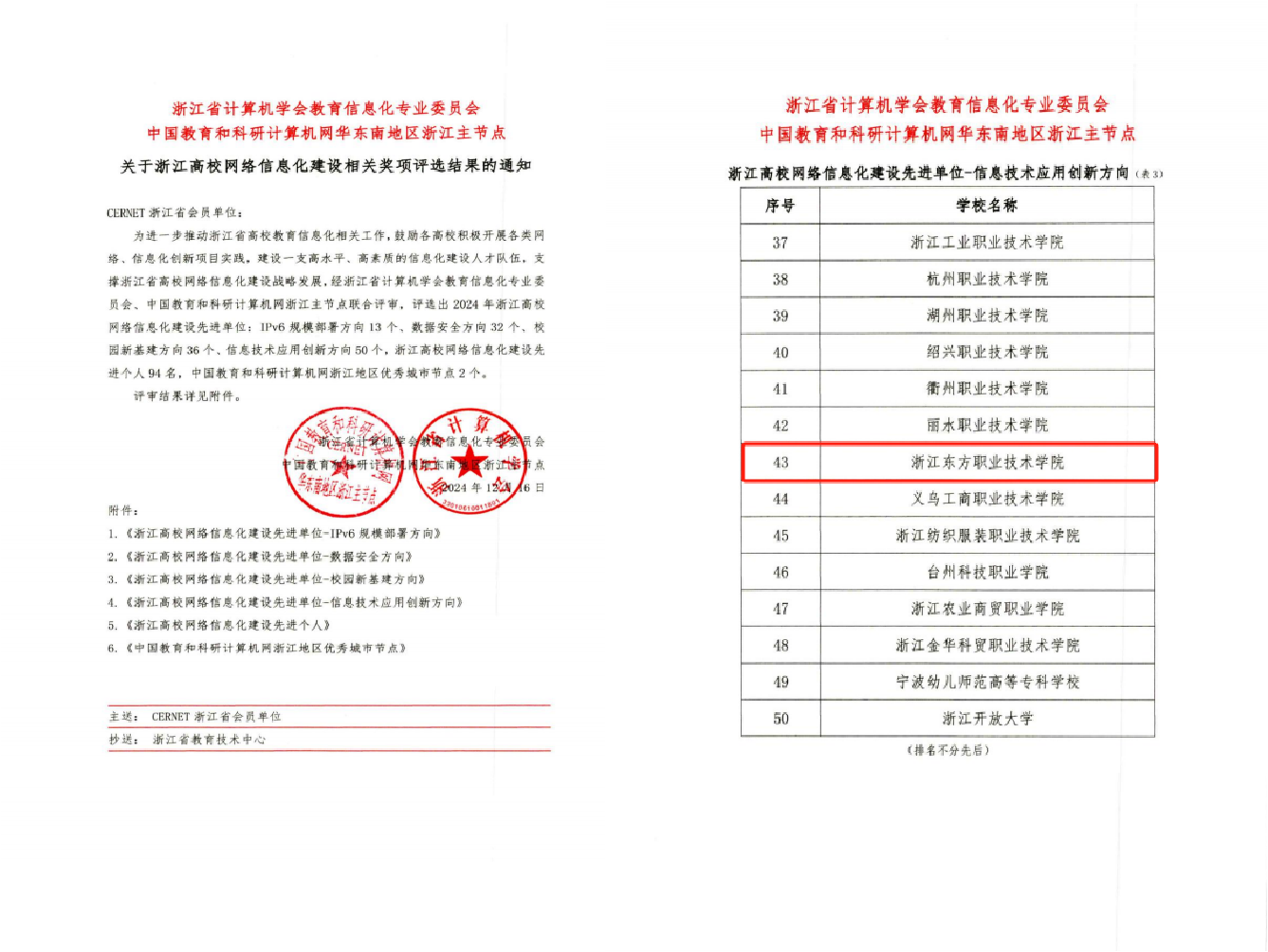 近日,浙江省计算机学会教育信息化专业委员会、中国教育和科研计算机网浙江主节点公布了2024年浙江省高校网络信息化建设工作先进单位等项目的评审结果。浙江东方职院获浙江省高校网络信息化建设“信息技术应用创新”先进单位荣誉。