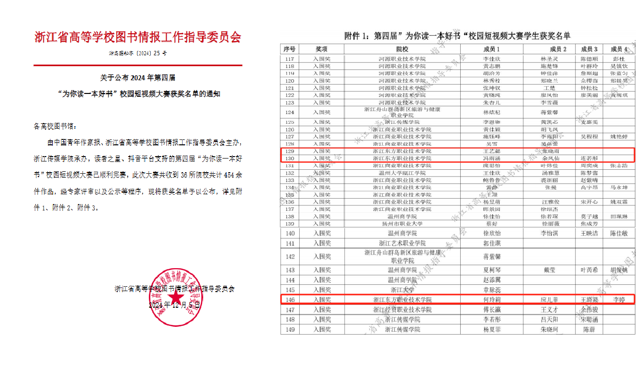 近日,2024年度浙江省第四届校园短视频大赛落下帷幕,大赛历时九个多月的筹办与组织,共收到36所参赛院校提交的454件作品。综合各参赛作品的网络数据表现以及专家评审成绩,浙江东方职院三支学生团队提交的阅读主题短视频作品脱颖而出,荣获浙江省第四届“为你读一本好书”校园短视频大赛入围奖。