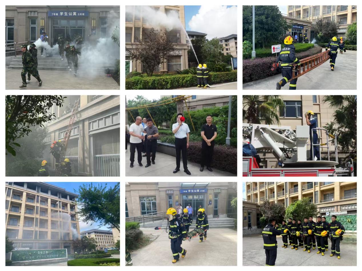 下午14时,演练总指挥、学校党委委员、副校长项忠宣布演练开始。模拟火情发生于学生公寓6号楼303寝室,学校消控应急指挥中心接警后立即启动应急预案,疏散组、安全保卫组、医疗保障组和义务消防队迅速赶赴现场展开救援。义务消防队作为第一梯队实施灭火,安全保卫组配合疏散组组织学生撤离;星海消防救援站官兵随后抵达,利用消防梯成功营救2名被困学生,并对1名窒息学生进行现场救护。全体新生在教师指引下捂住口鼻、低姿快速有序撤离至安全区域。演练结束后,保卫部负责人对过程进行点评总结。消防救援大队宣传办主任林加森为新生作了消防安全知识培训。