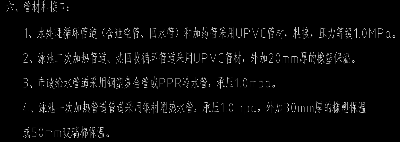 1、招标图纸的设计说明中明确“1、水处理循环管道(含泄空管、回水管)和加药管采用UPVC管材,粘接,压力等级1.0MPa。2、泳池二次加热管道、热回收循环管道采用UPVC管材,外加20mm厚的橡塑保温。3、市政给水管道采用钢塑复合管或PPR冷水管,承压1.0mpa。4、泳池一次加热管道管道采用钢衬塑热水管,承压1.0mpa,外加30mm厚的橡塑保温”;